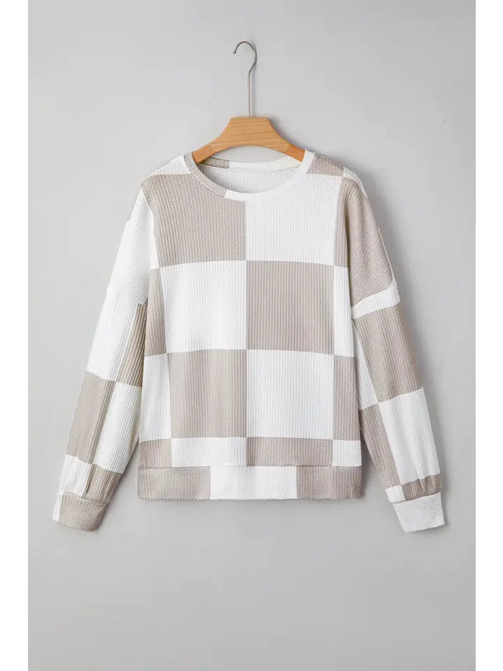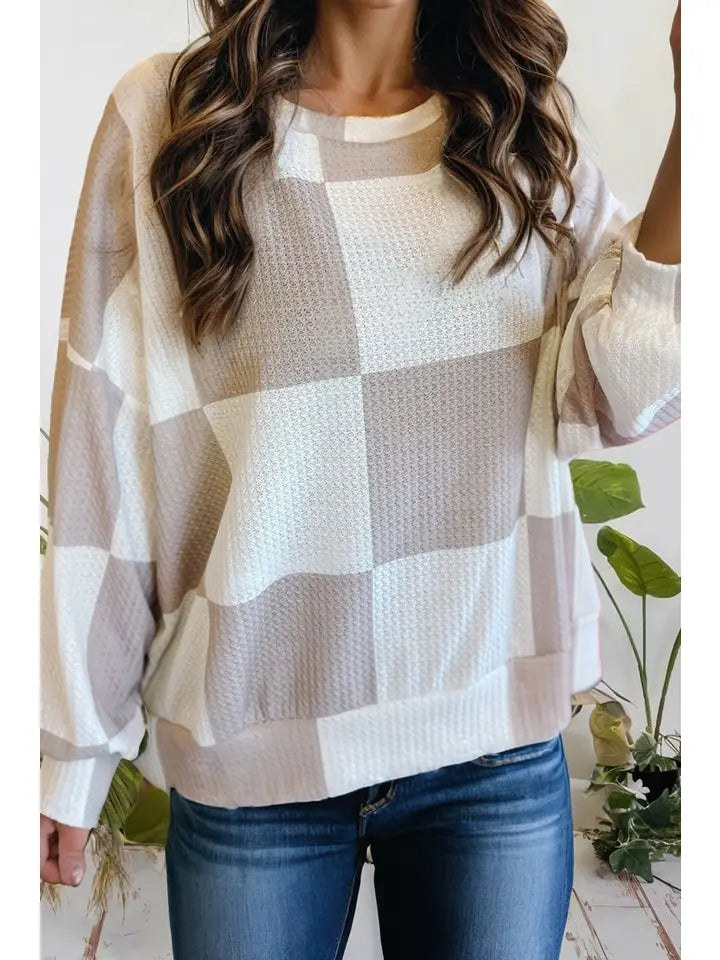 Checkered Print Breathable Textured Long Sleeve Top