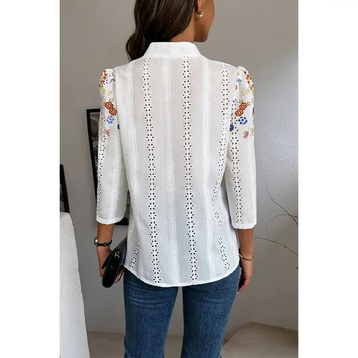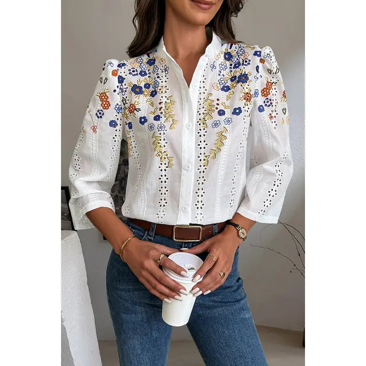 Material: 100% PolyesterFeatures: Floral Hollow Out Button Down Long Sleeve BlouseOccasion: Casual/Daily/Outdoor/Vacation/School/Going Out.