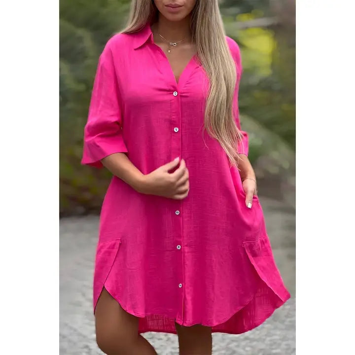 Material: 100% PolyesterFeatures: Plus A Line Button Loose Fit Pockets Solid DressOccasion: Casual/ Daily/Outdoor/Vacation/School/Going Out.