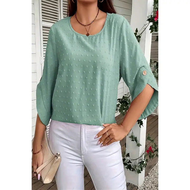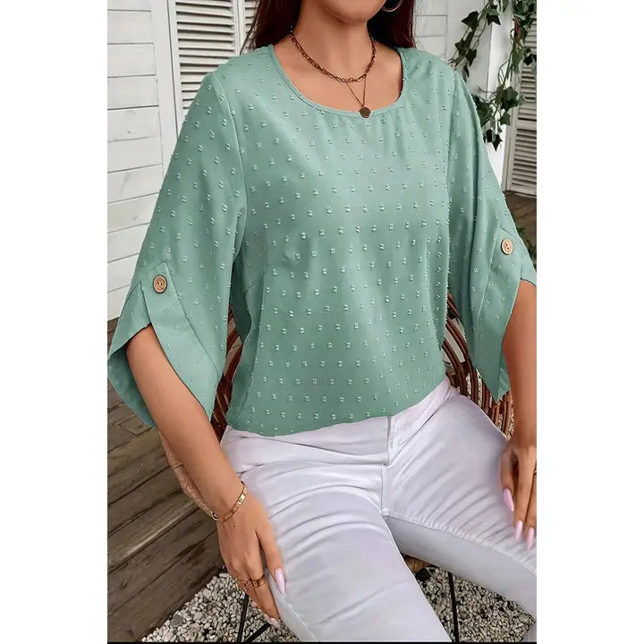 Material: 100% Polyester Features: Solid Swiss Dot Round Neck Loose Button Trim Top Occasion: Casual/Daily/Outdoor/Vacation/School/Going Out.
