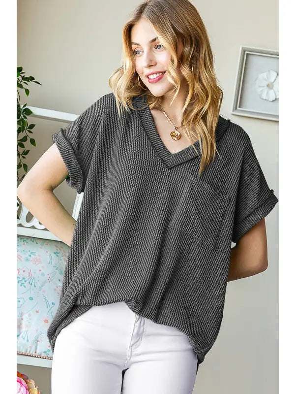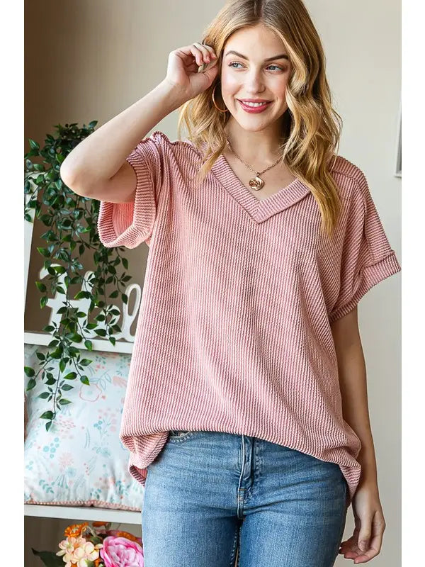 Description95% POLYESTER 5% SPANDEXDOLMAN SHORT SLEEVE WITH BAND V NECK WITH BAND SOLID URBAN RIBBED TOP WITH ROUND HEM AND STITCH DETAIL