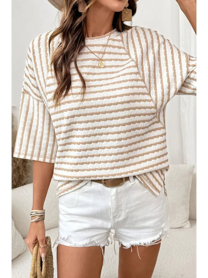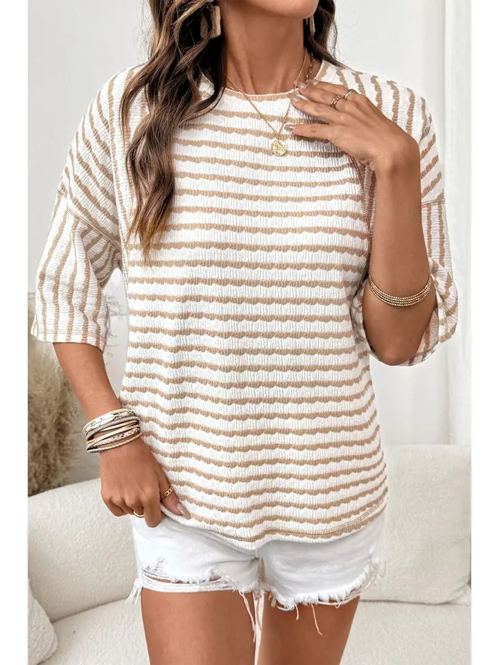 Stripe Textured Knit Split Hem Half Sleeve Top