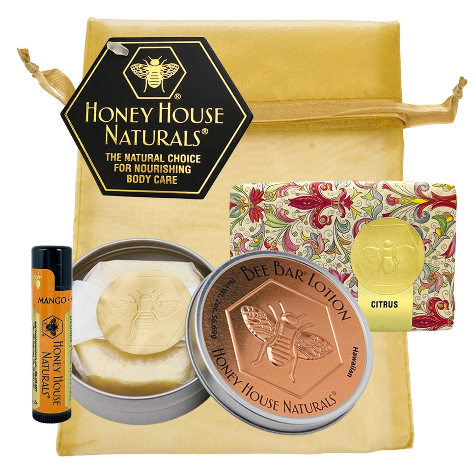 Three wonderful products combined into one great gift that will soothe, moisturize, protect and rejuvenate. A Beautifully wrapped 3.5oz soap bar that is loaded with Shea Butter and honey, this gentle soap will cleanse, condition and re-hydrate thirsty skin. A large Bee Bar Solid Lotion (2oz) melts on skin to fully moisturize and soothe dry and damaged hands and skin. A lip Butter tube is creamy and moisturizes dry lips.