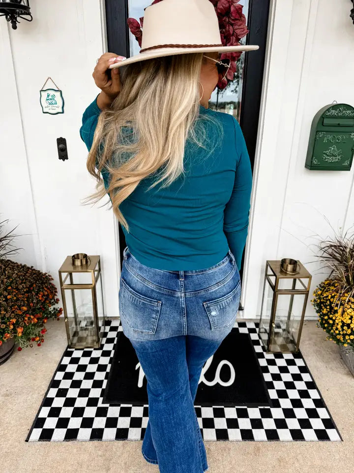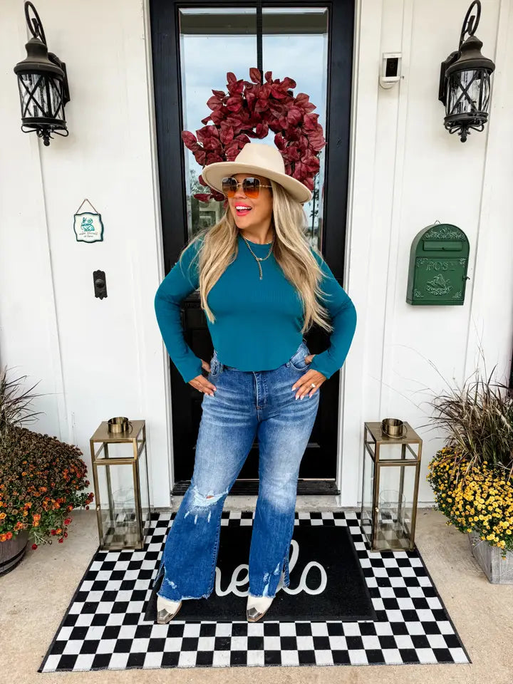 Features a high/low front/back with curved sides that form fitting, small waist appearance! Features thumbhole sleeves.