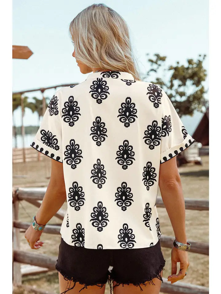 Fashion-W Boho Geometric Print Short Sleeve V Neck Blouse
