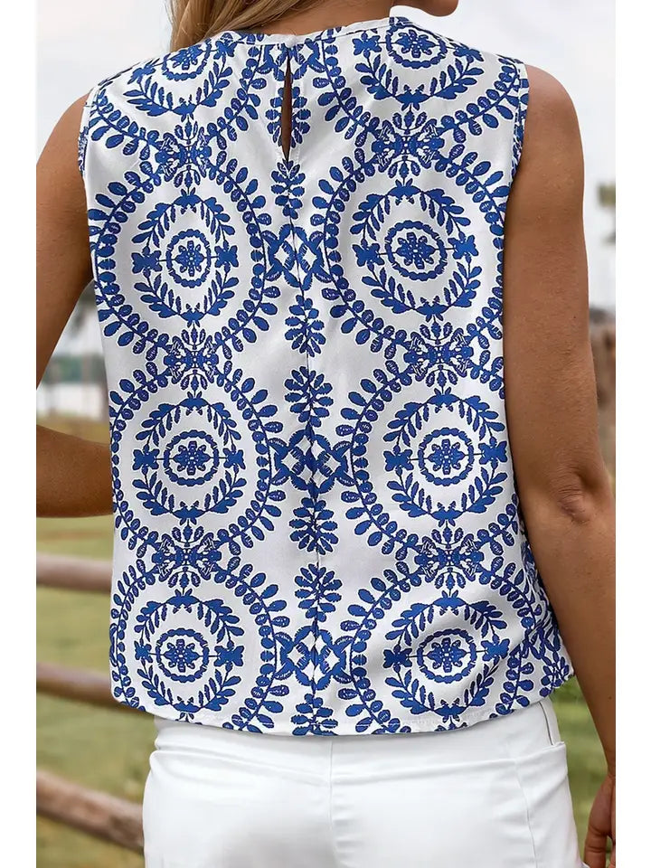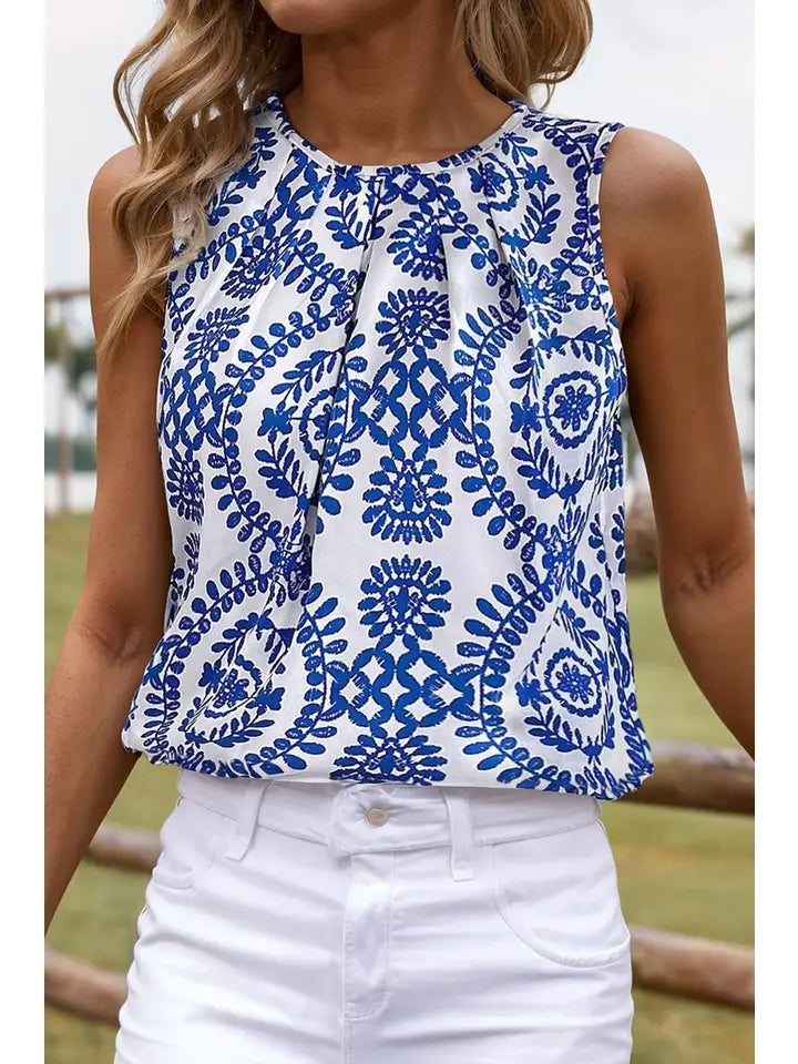 Fashion-W Boho Vintage Print Pintuck Crew Neck Tank Top