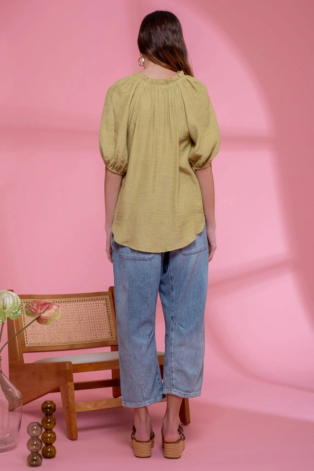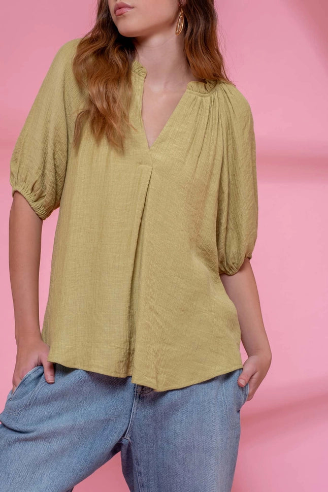 - Scrunched vneck - Short scrunch sleeve- Elastic sleeves- Unlined- Shell: 64% rayon 36% polyester