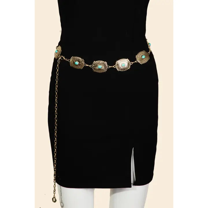 Make a bold statement, this chain belt possesses a fine turquoise studded oval design. Redefine your fashion identity with this versatile chain belt, a timeless piece that complements any wardrobe.