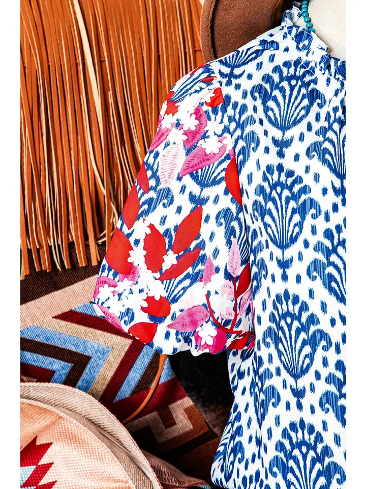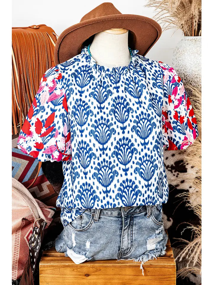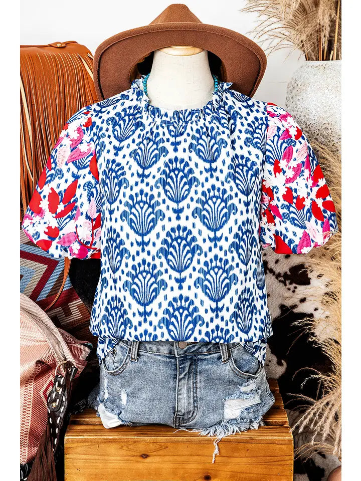 Western Fashion Print Floral Puff Sleeve Frill Neck Blouse
